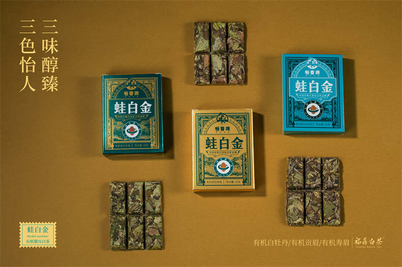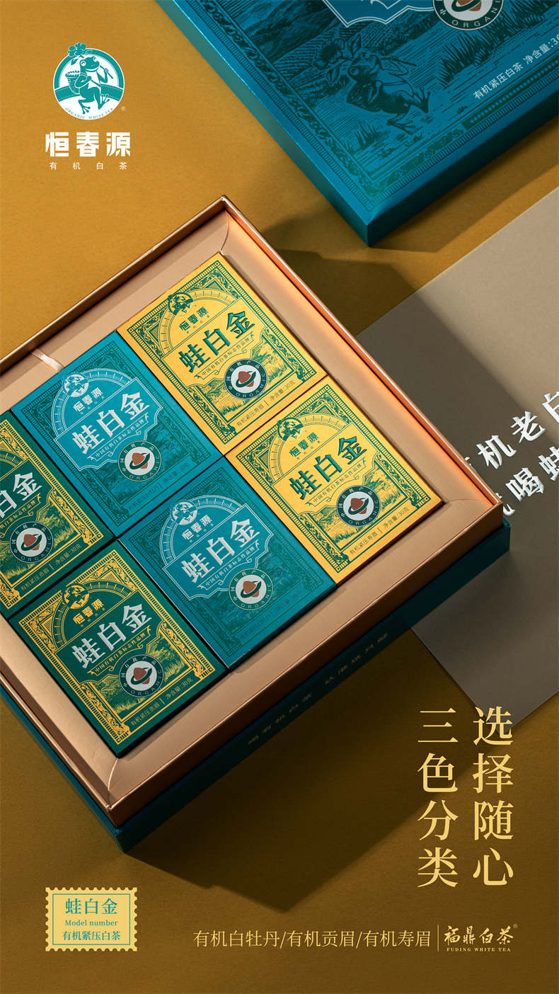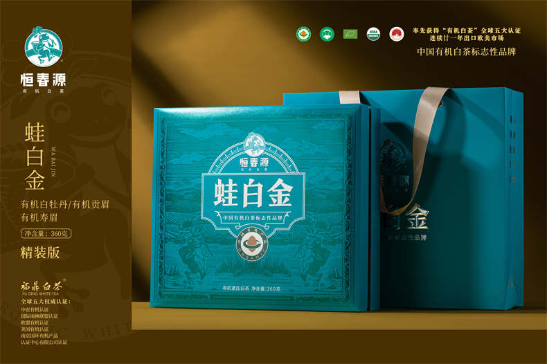 產品名稱:24版蛙白金·精裝版 零售價: 850元/盒 凈含量:360克/盒 原料:2021年有機牡丹60g(30g*2)、2021年有機貢眉120g(30g*4)、2021年有機壽眉180g(30g*6) 裝箱量:10盒/件