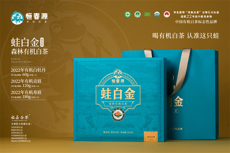25版蛙白金.精裝版 統(tǒng)一零售價:750元 系列:蛙白金系列 凈含量:360g 配料:2022年有機(jī)牡丹(30g*2) 2022年有機(jī)貢眉(30g*4) 2022年有機(jī)壽眉(30g*6) 裝箱量:10盒/件