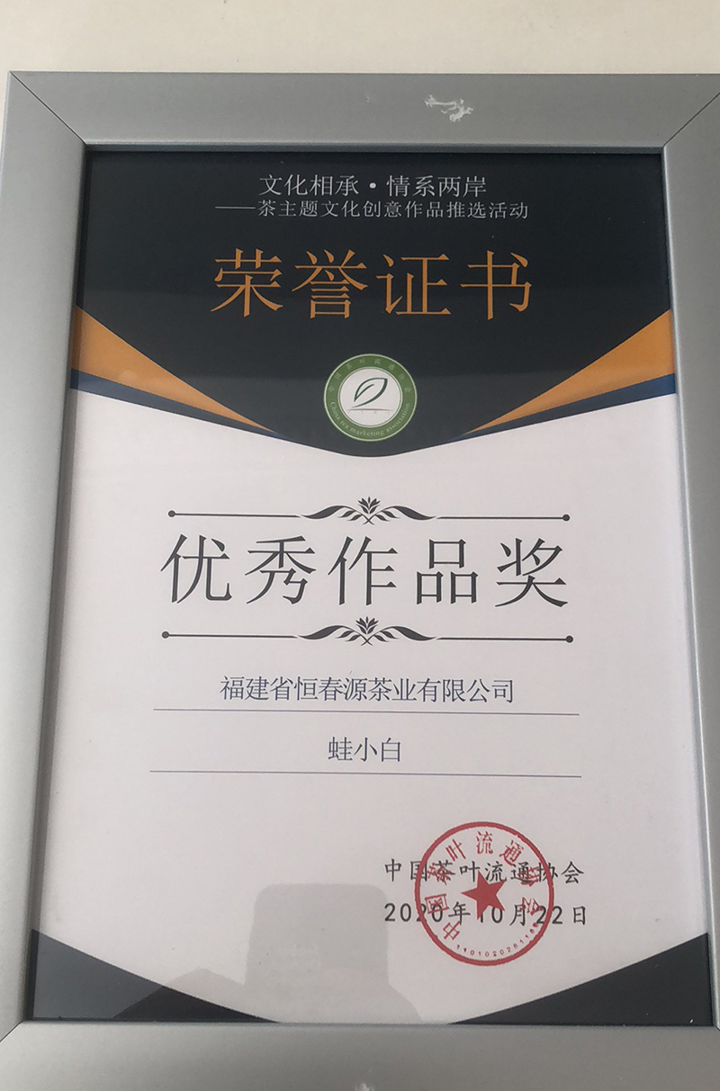 2020年10月22日,恒春源公司“蛙小白”系列產(chǎn)品在由中國(guó)茶葉流通協(xié)會(huì)主辦的“文化相承·情系兩岸活動(dòng)中榮獲”優(yōu)秀作品獎(jiǎng)“