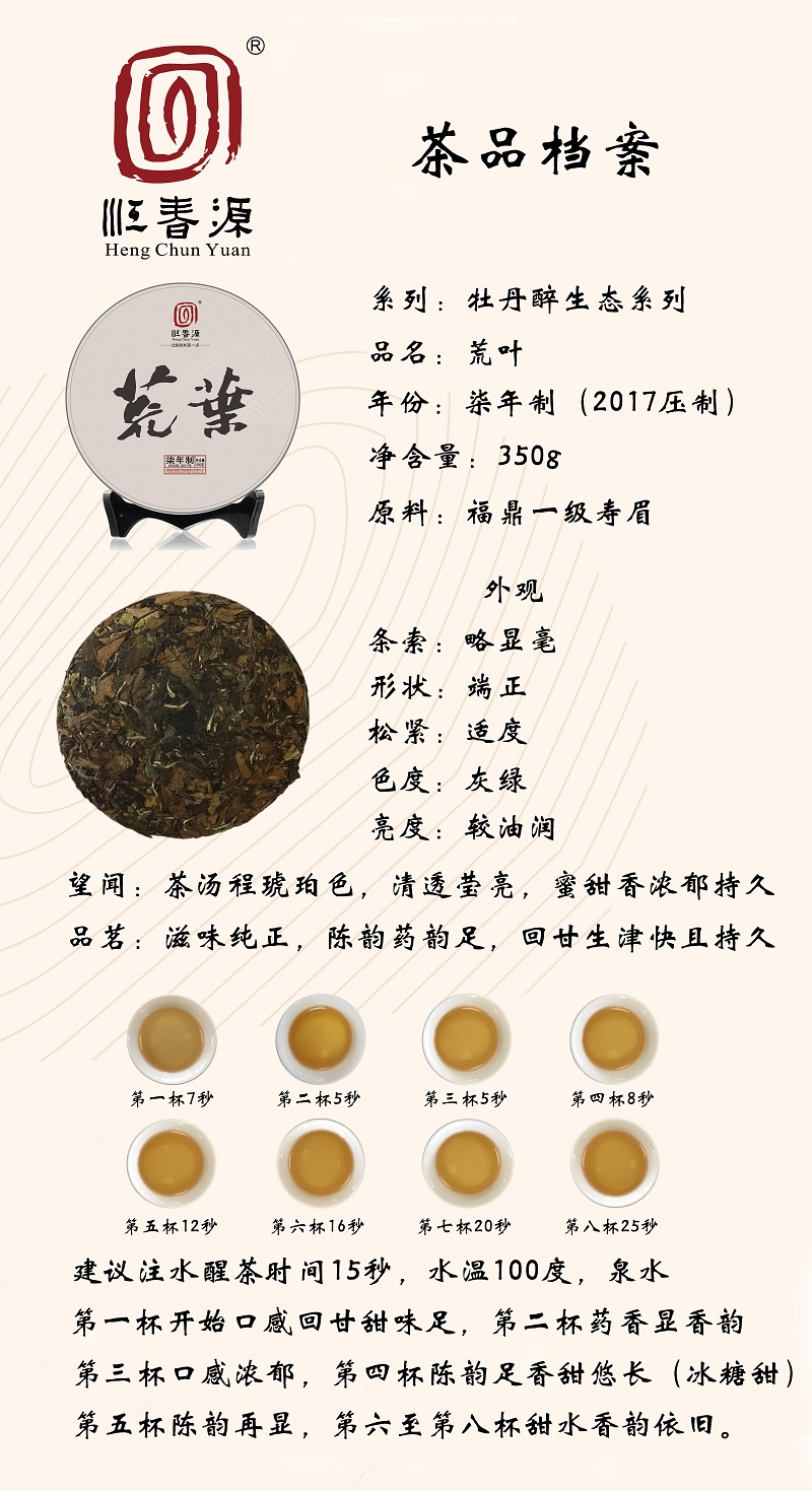 出品時(shí)間:2017年5月18日恒春源公司選用來(lái)自2010年4月28日所出品的佳陽(yáng)茶廠壽眉原料精心制作而成。