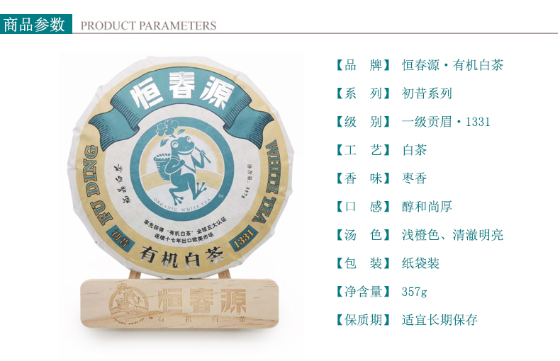產(chǎn)品名稱:初昔1331(緊壓白茶) 全國統(tǒng)一零售價:3450元/餅 配 料:2013年一級貢眉 凈 含 量:357g 生產(chǎn)日期:見噴碼 保 質(zhì) 期:適宜長期保存,十五年之內(nèi)飲用最佳 貯存方法:密封、避光、防潮、防異味