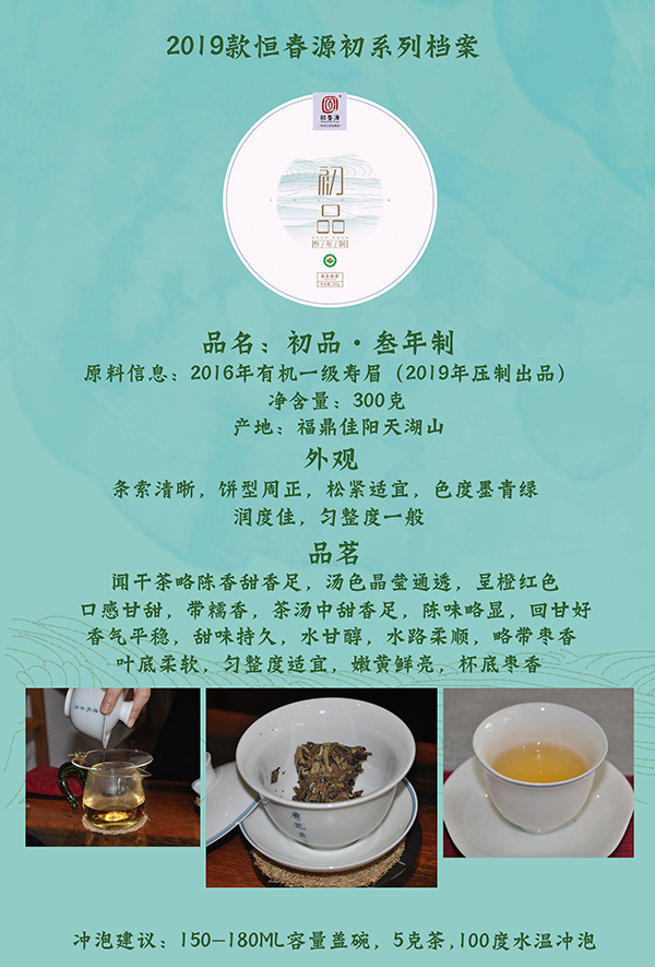 出品時(shí)間:2019年3月1日恒春源公司選用來(lái)自2016年4月30日所出品的天湖山有機(jī)壽眉原料精心制作而成。